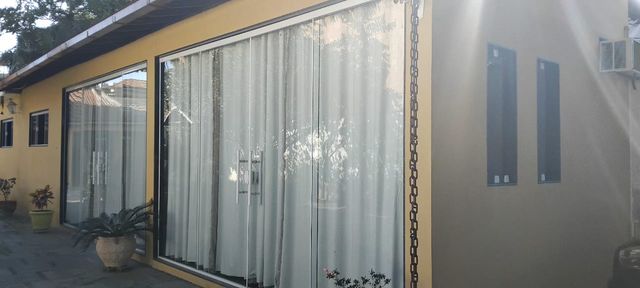 Casa com 1 quarto, amplas portas de blindex, sala com porta em blindex, cozinha com janelas em blindex, banheiro todo em cerâmica, área de serviço, e escada para construção de 2 pavimento.